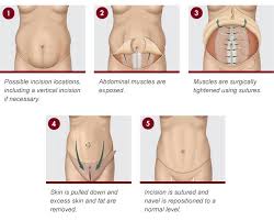 4. الإزالة وإعادة الوضع: يُزال الجلد والدهون الزائدة. يُشد الجلد المتبقي للأسفل، وتُعاد السرة إلى موضعها الطبيعي.