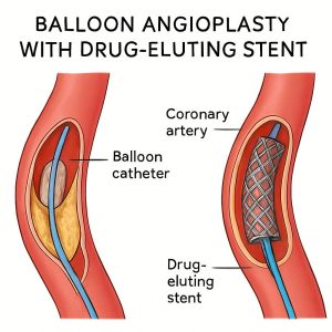 Definition: A procedure where a blocked artery is opened with a balloon and a small, mesh tube (stent) coated with a slow-release drug is permanently placed to keep the artery open.