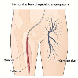 Definition: A minimally invasive procedure to visualize the coronary arteries using X-ray and contrast dye. Access is gained through the femoral artery in the groin.